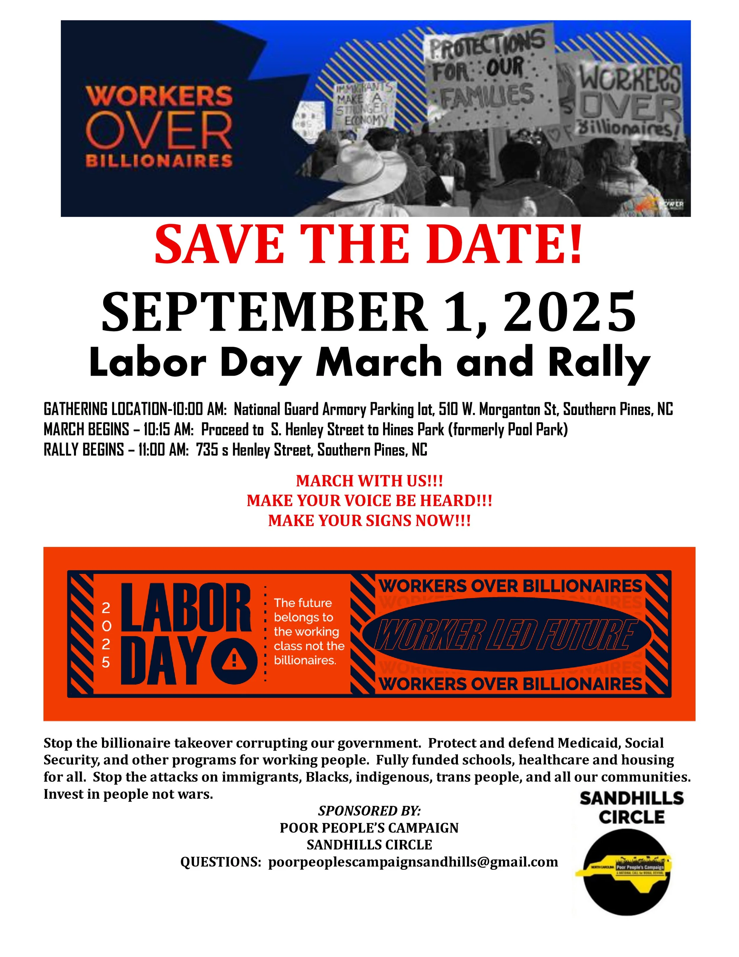 Join the Sandhills Circle of the Poor People’s Campaign as we march and rally as part of a nationwide action to support the interests of working people over the interests of billionaires.